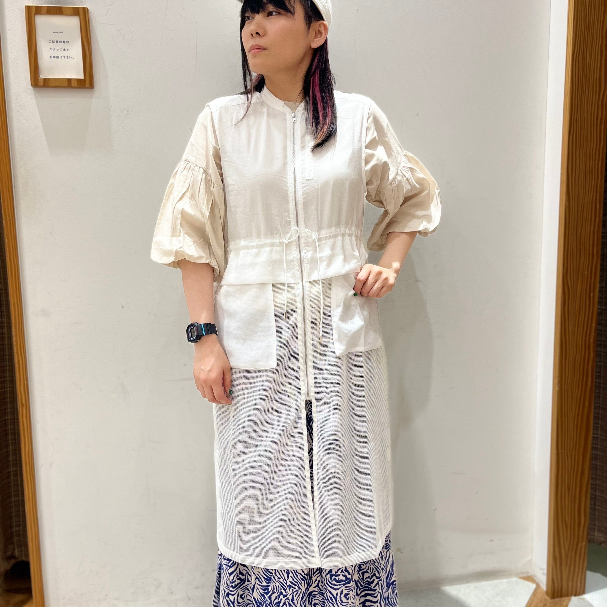 季節の変わり目にとっても重宝するシアー感たっぷりのロングジレに、とろみのある柄スカートを合わせた爽やかなコーディネートにしました!