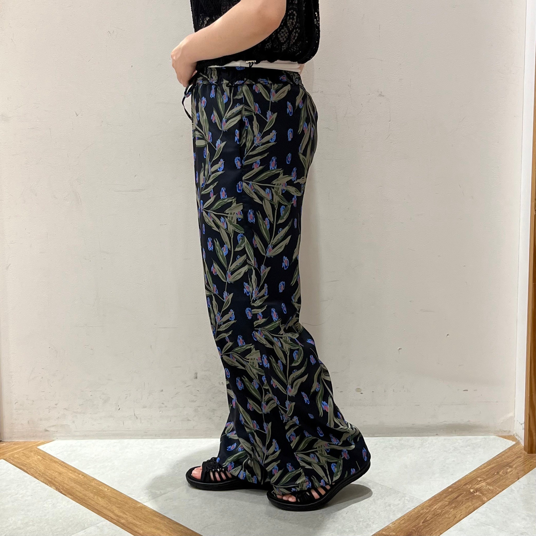 ポリエステル100%生地を使用し、落ち着いたボタニカル柄のプリントを施したストレートシルエットのパンツ。