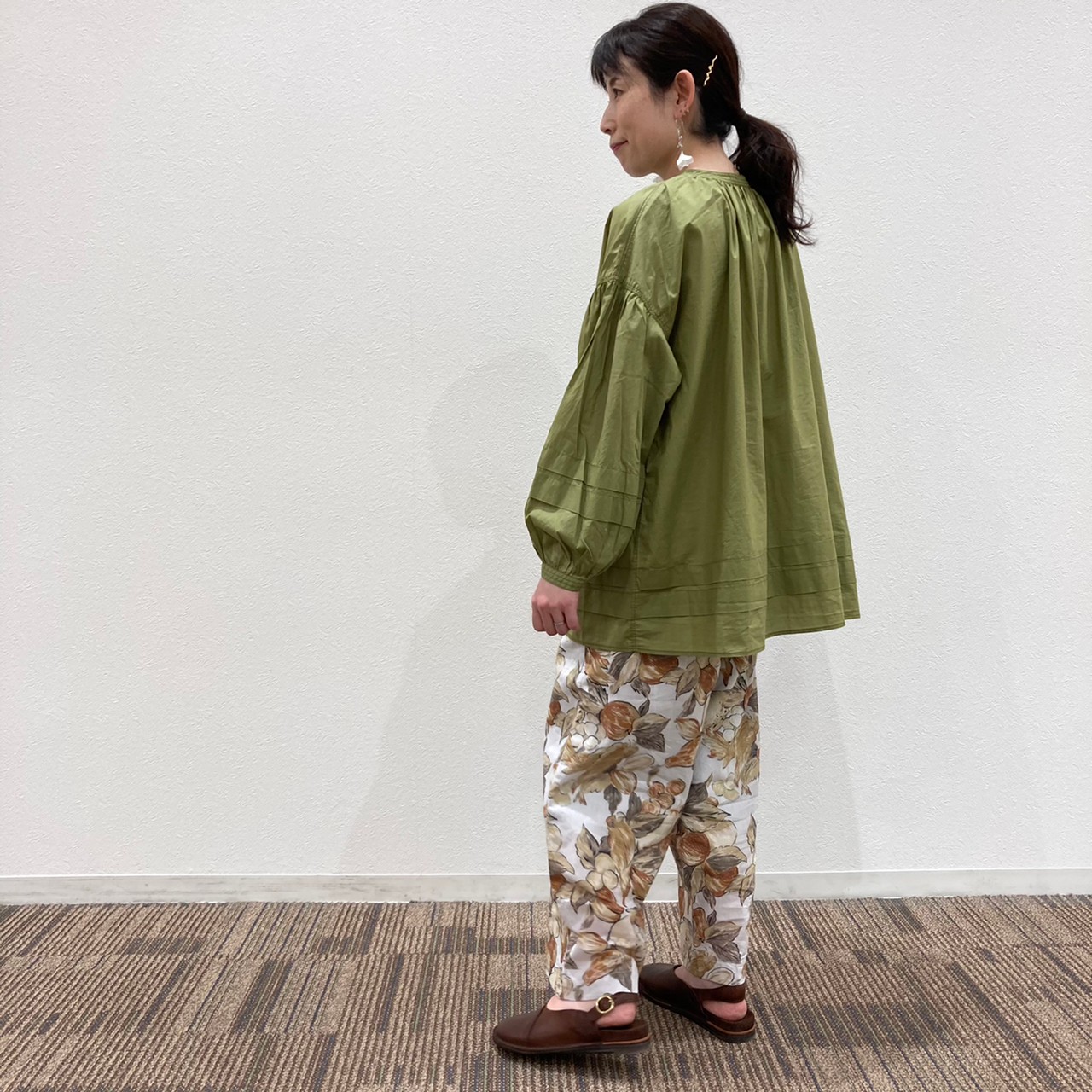 花原はパンツとフェミニンテイストのブラウスを合わせて