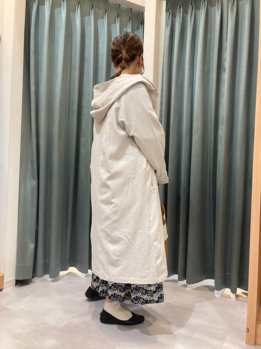 こちらはフードタイプのコートで爽やかな寒色カラーのコーディネート。