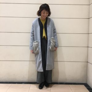 今年のトレンド、エコファーをポケットに取り入れたノーカラーコート!!