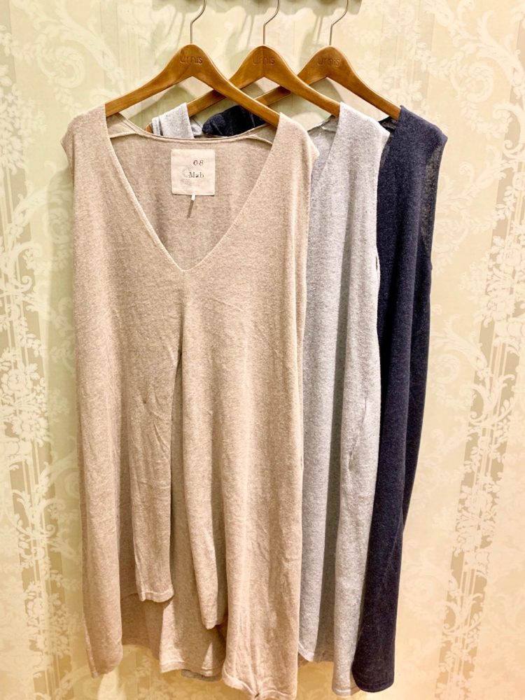 【08Mab】のノースリーブワンピースと綿麻ニットの重ね着スタイルです!