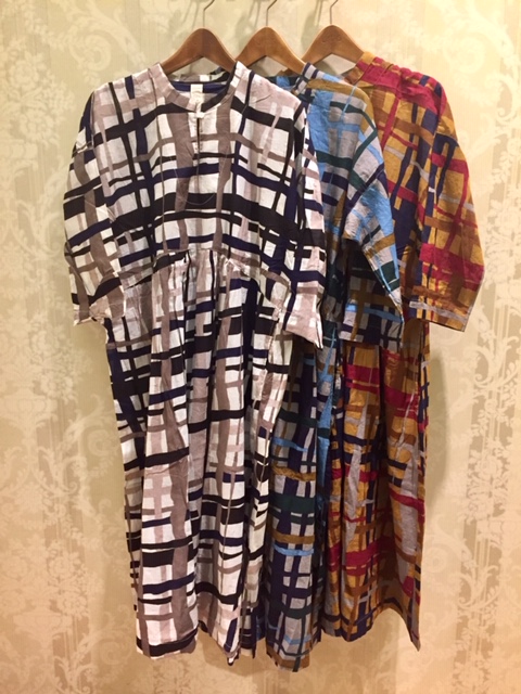 ボイル手描きチェックスタンド衿ワンピース