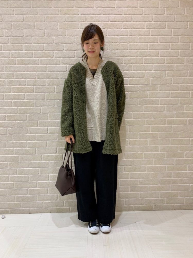 ボアコートにゆるっとパンツを合わせた楽チンコーデです。