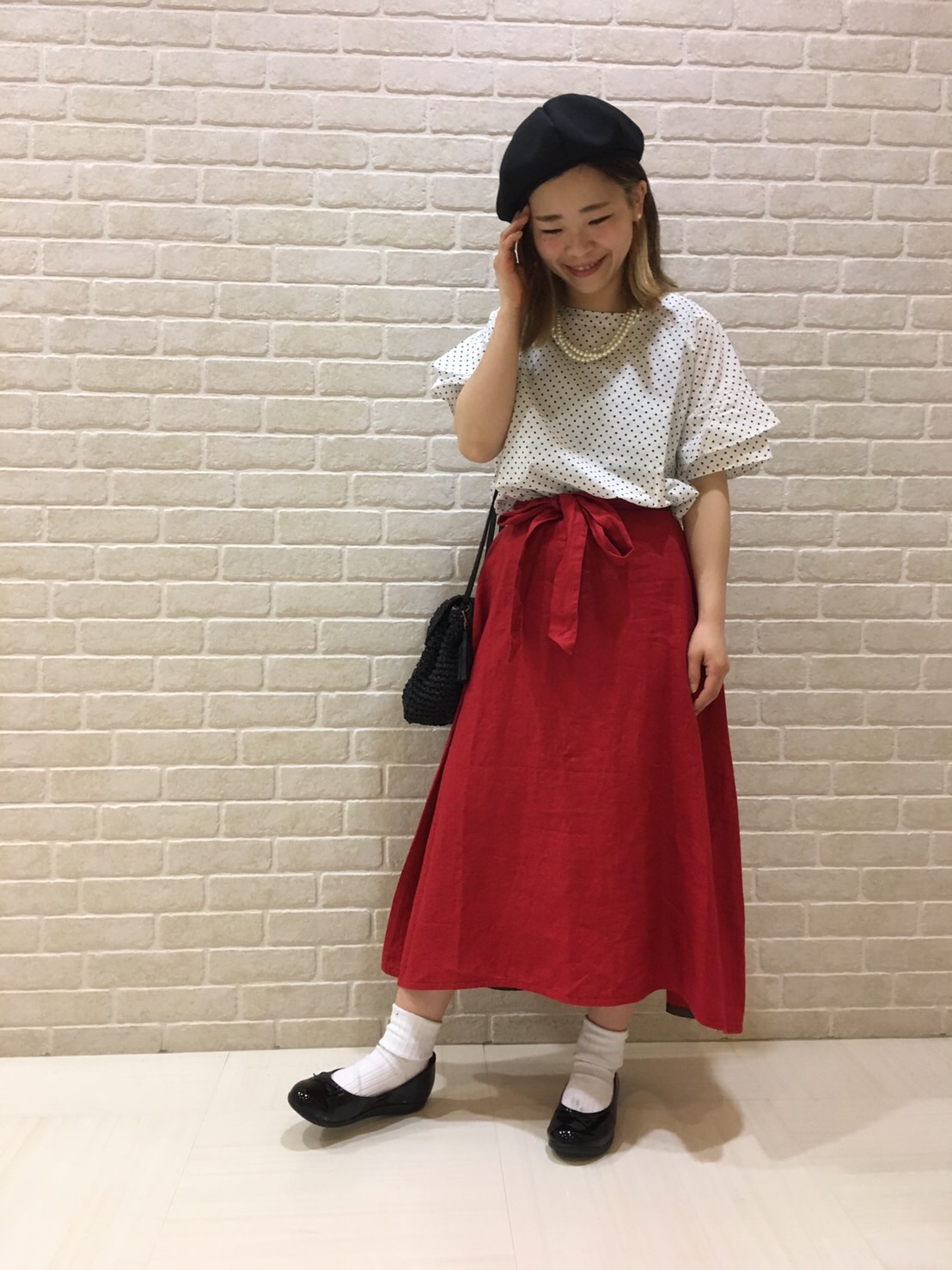 赤いスカートをメインに、ちょっぴりレトロな綺麗目コーデに。