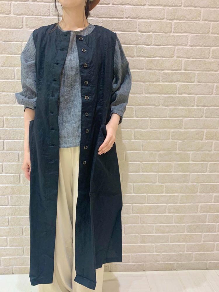 袖がフワッとなったプルオーバーに、ロングジレを合わせた大人ナチュラルコーデです。