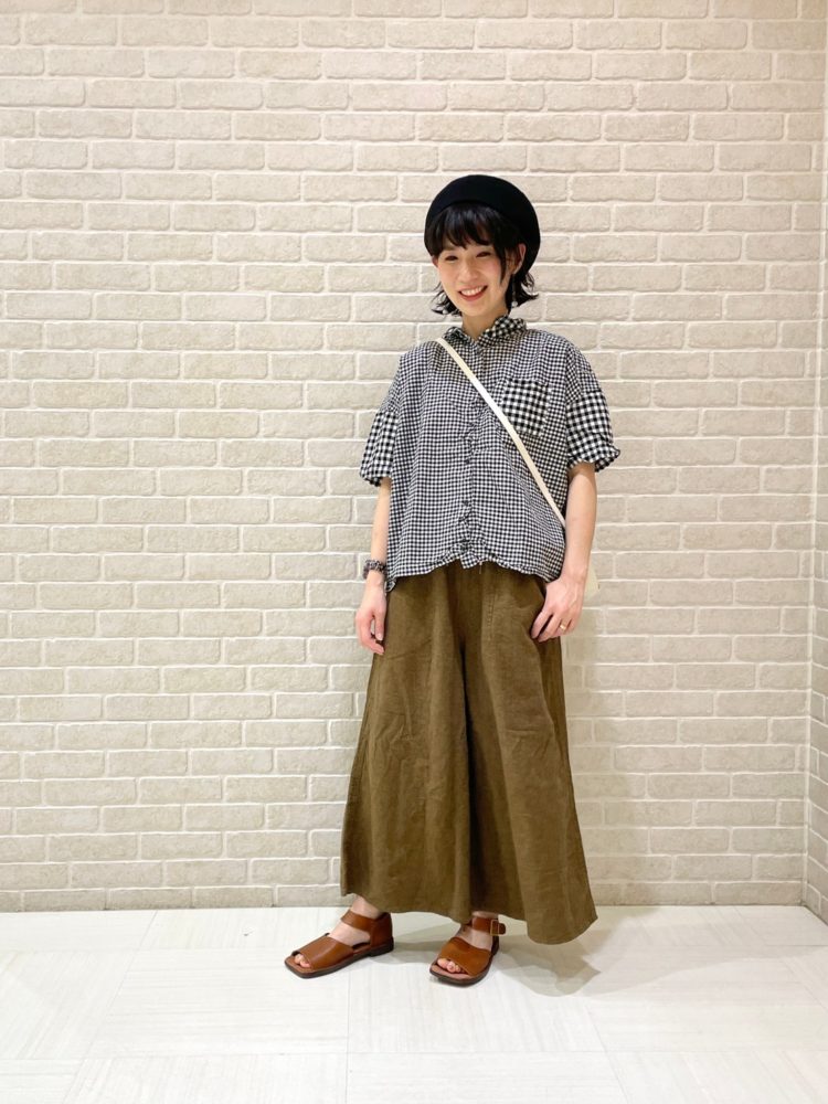 ギンガムチェックのシャツと合わせ、ナチュラル×カジュアルのMIXスタイルに。