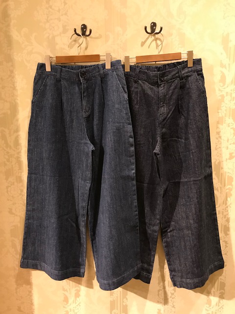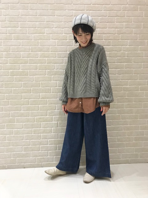 丈の短めニットは、ワイドパンツやスカートにピッタリ。