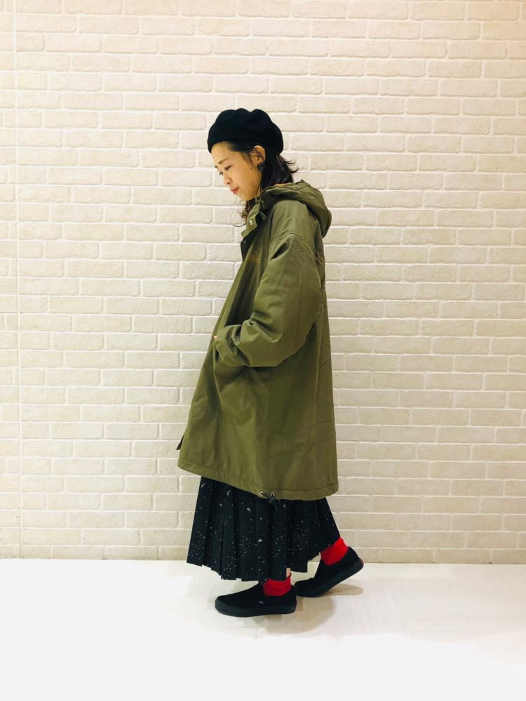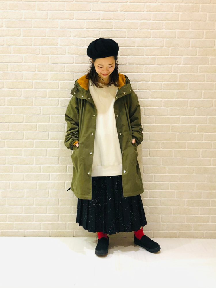 カジュアルなフードコートに、プリーツスカートで女性らしさをプラスした、カジュアルMIXコーデ。