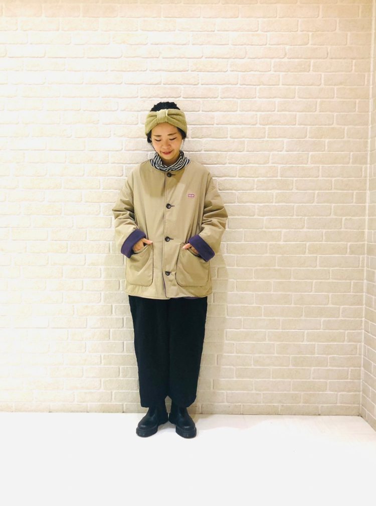 ノーカラーなので、ハイネックインナーや、マフラーなど小物づかいが楽しめますよ◎