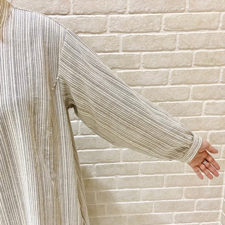 適度な厚みのある麻混素材で、細めのストライプの柄が爽やかなワイドパンツ。