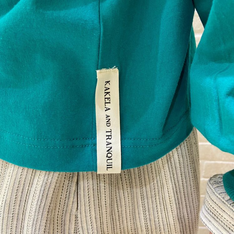 次は、【KAKELA and TRANQUIL / カケラ アンド トランクイル】の青味の強いグリーンカラーのコットンカットソーを使ってみました。