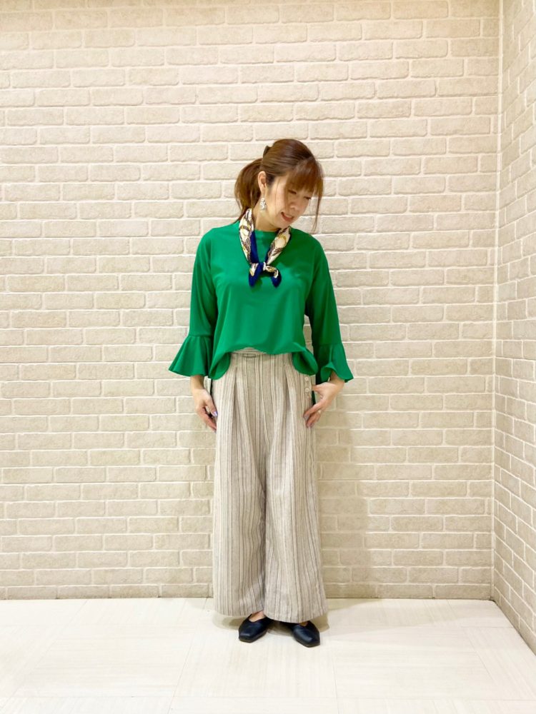 本日は、目を引くグリーンカラーのプルオーバーを着てシンプルコーデにしてみました♪