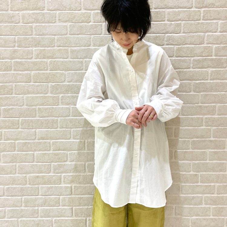 シンプルながら、個性的なデザインのシャツを羽織ることで、こなれ感と大人っぽさを演出。