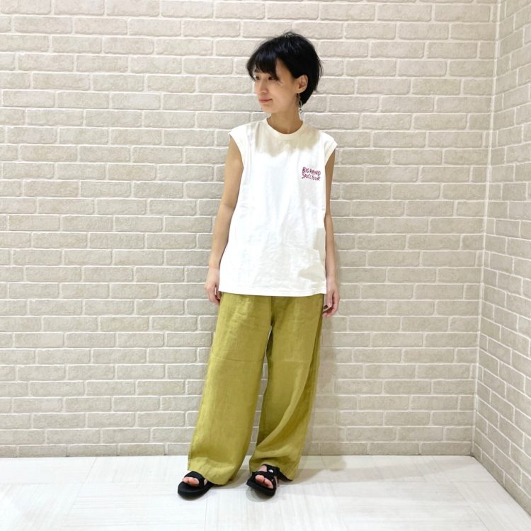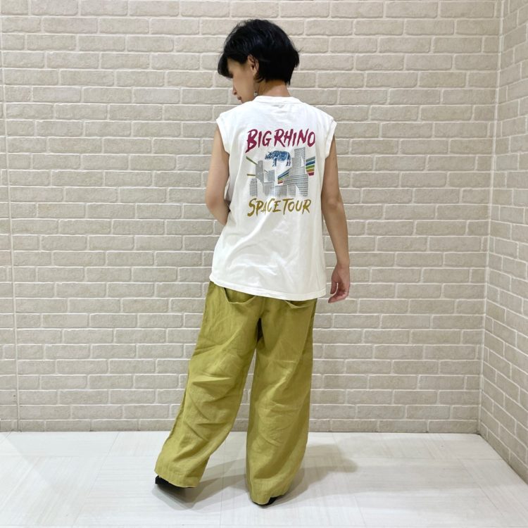 少しスモーキーなイエローのAntgaugeのサロペットに、ホワイト系トップスを合わせたナチュラルMIXスタイル。