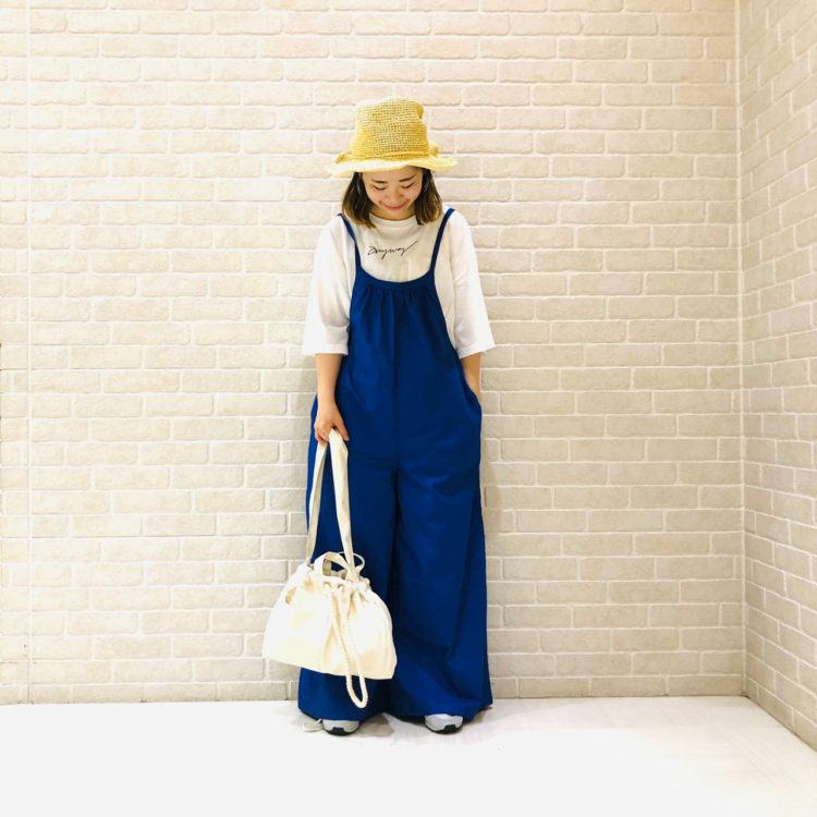 ブルーのサロペットに、麦わら帽子を合わせた、爽やかコーデ。