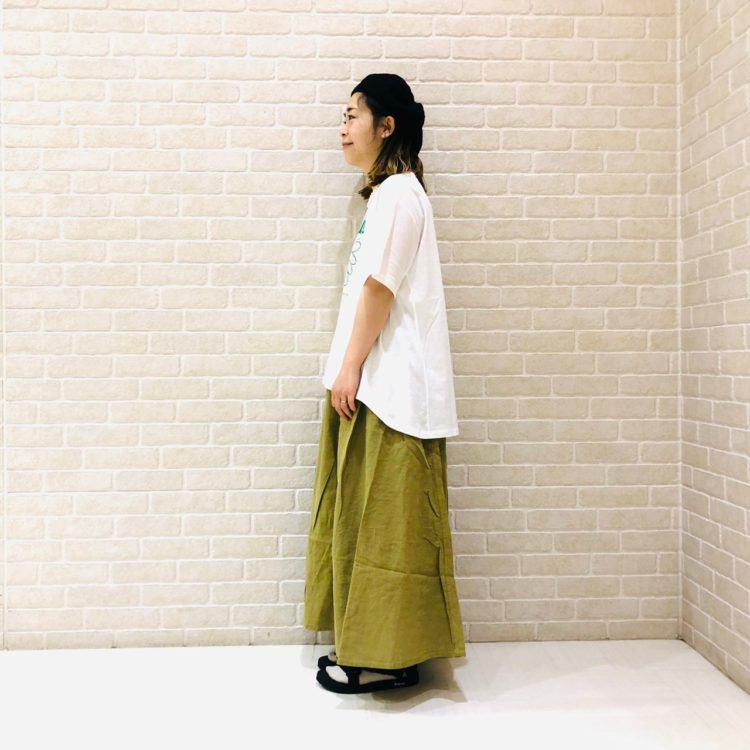 グリーンの花柄Tシャツで合わせた、レトロカラーコーデ。