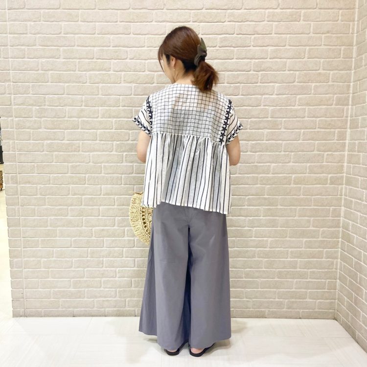 そして、ハリのある独特な綿生地のパンツを合わせて甘くなり過ぎないようにコーデしました。