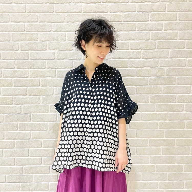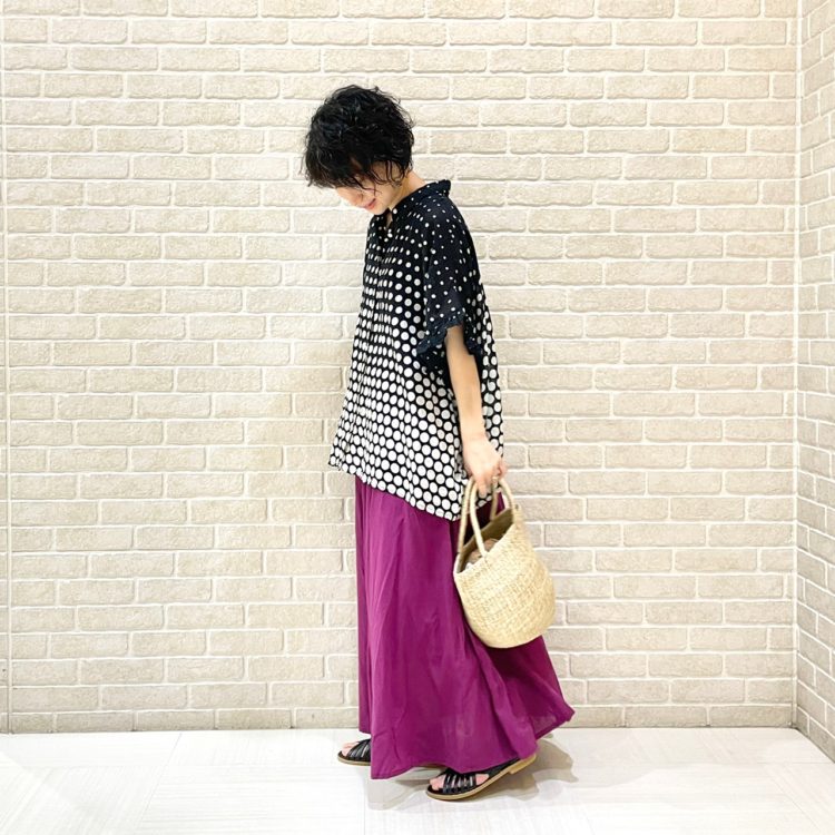 水玉柄が目を惹くシャツに、パープル色のスカートを合わせた、リラックスレディコーデ。