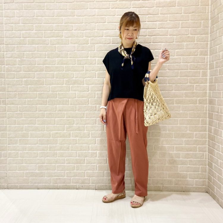 【 RNA-N 】のベストと、柔らかいオレンジカラーが目を引く【 ZAMPA 】とのパンツコーデ!