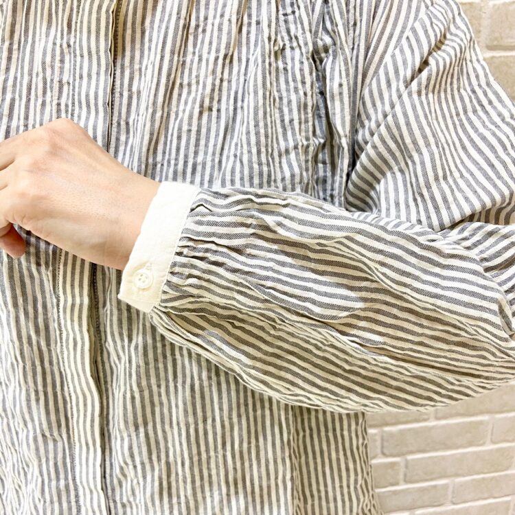 肩や背中の切り替え部分そして袖口には、細かいシャーリングが施されています。