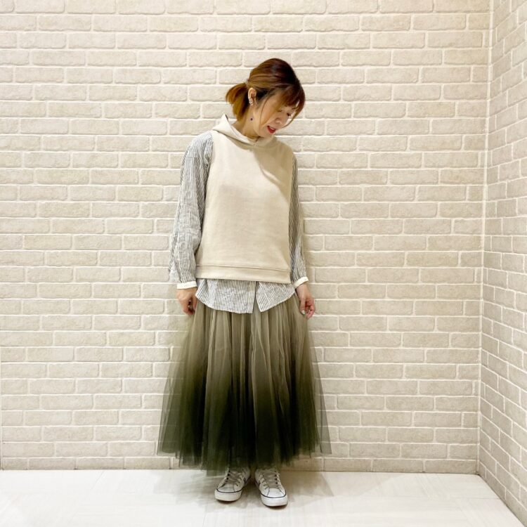 本日は、フード付きアイテムのベストとプルパーカーでカジュアルコーデにしてみました♪