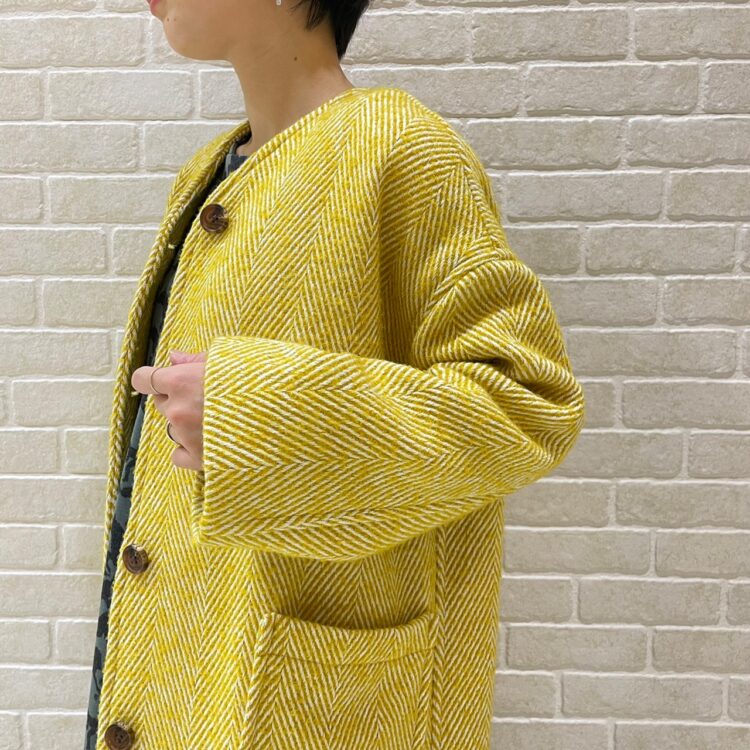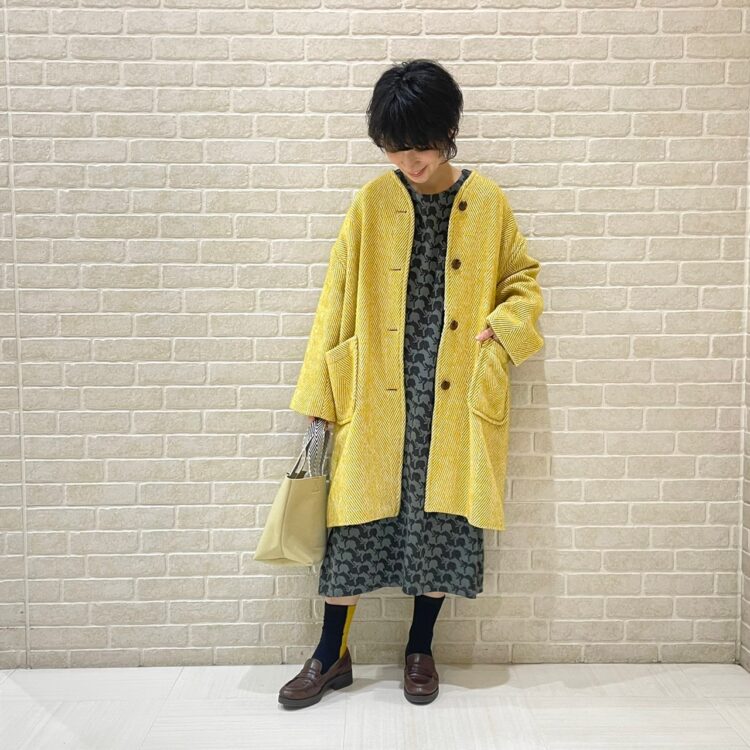 目を惹くイエローカラーのコートに、ワンピースを合わせた大人可愛いスタイルに。