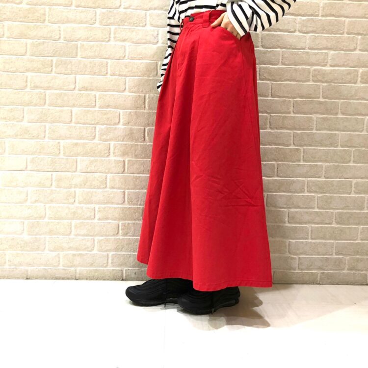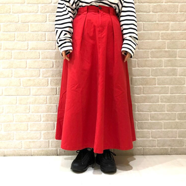 目を惹く『アカ』のスカートにボーダーのカットソーを合わせたラフコーデ♪