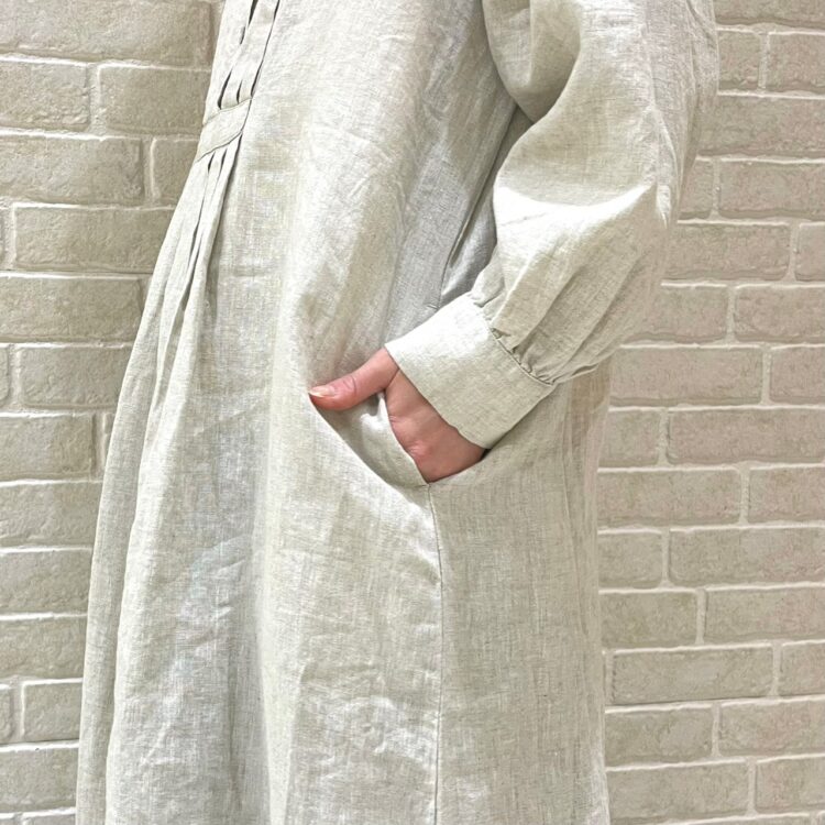 シャリ感はありつつ滑らかな質感が魅力的な14番手リネンで作られたワンピース。