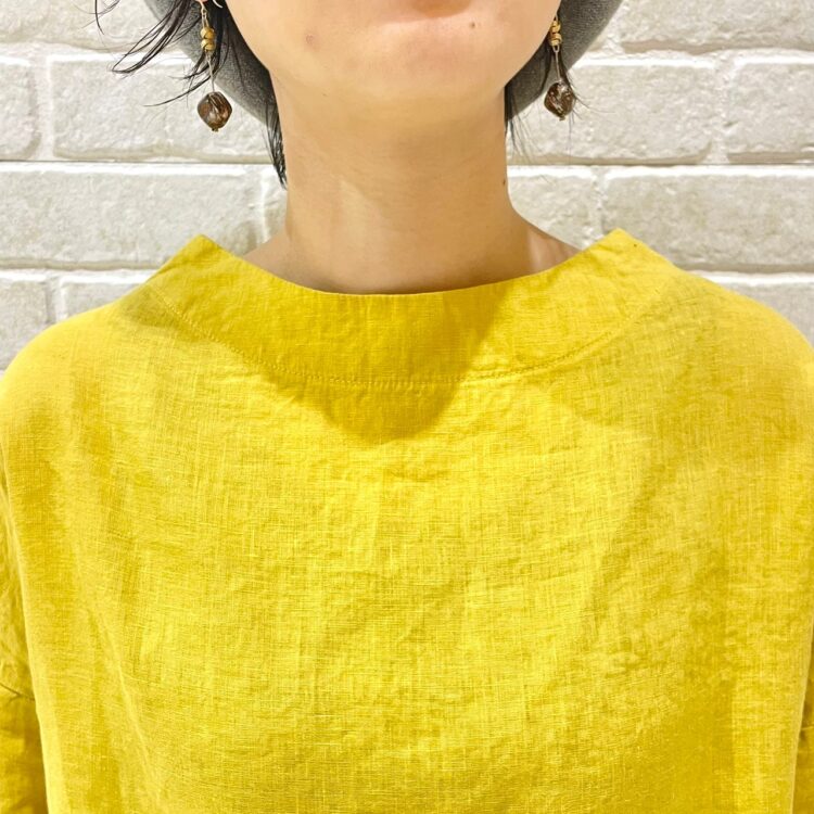 首元にスッキリ感を与えてくれるノーカラーデザイン。