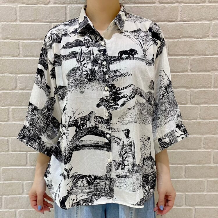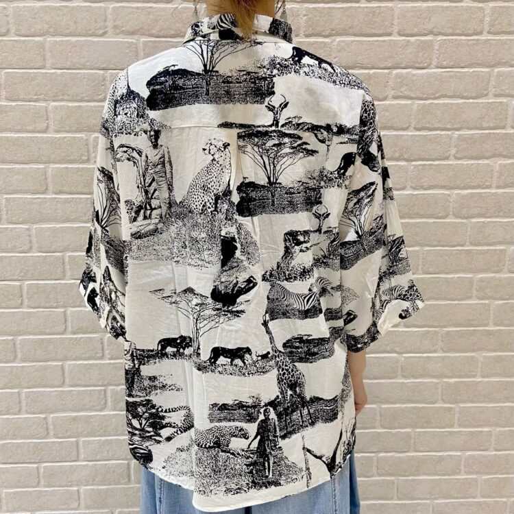 柄をよく見るとインパクトのあるサファリ柄のシャツ☆
