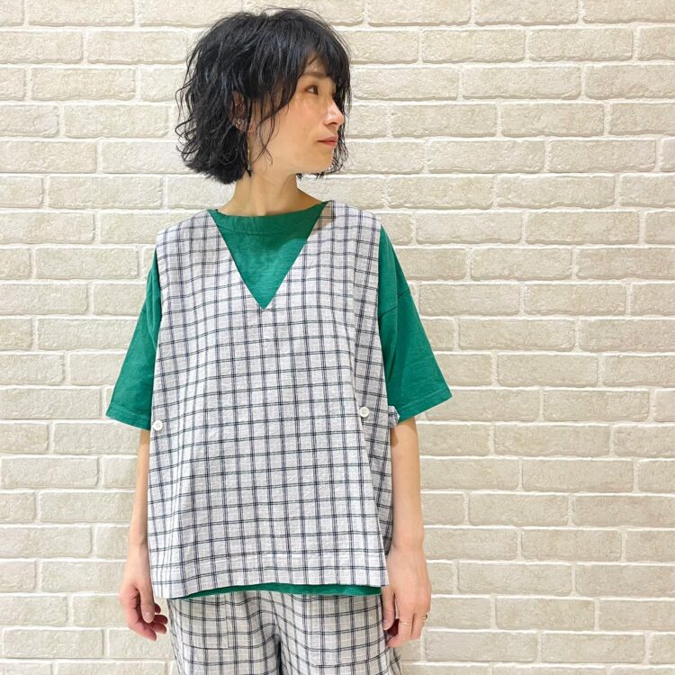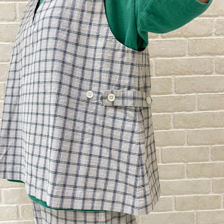 Vネックのラインが綺麗な綿麻素材のベストは、身幅もゆったりめで重ね着しやすい!