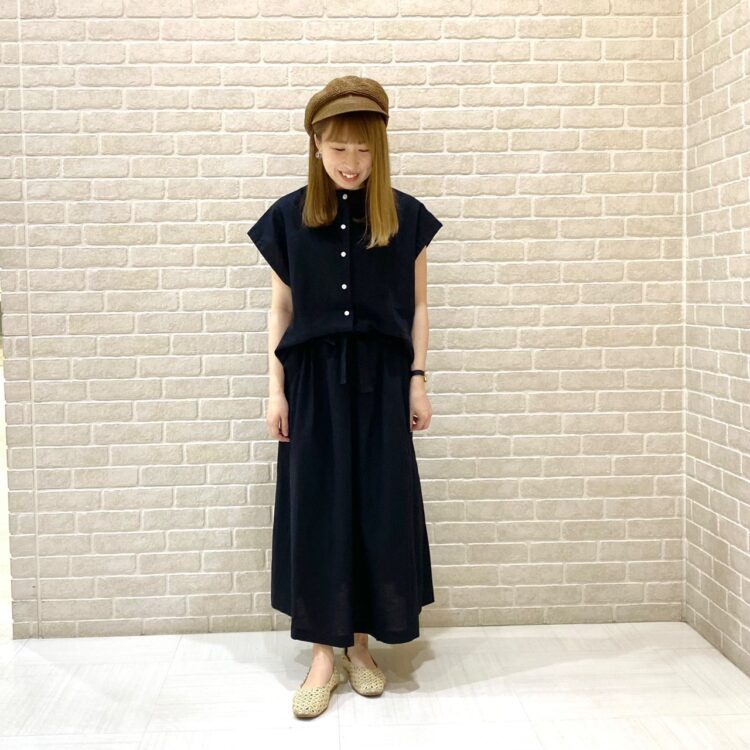 ボトムスには、同素材のスカートと合わせたセットアップコーデに♪