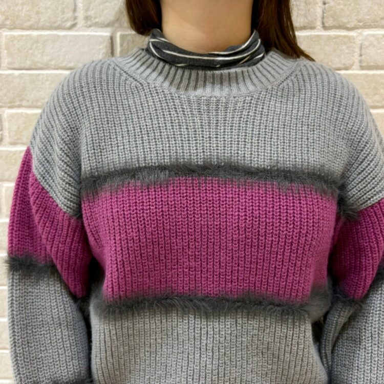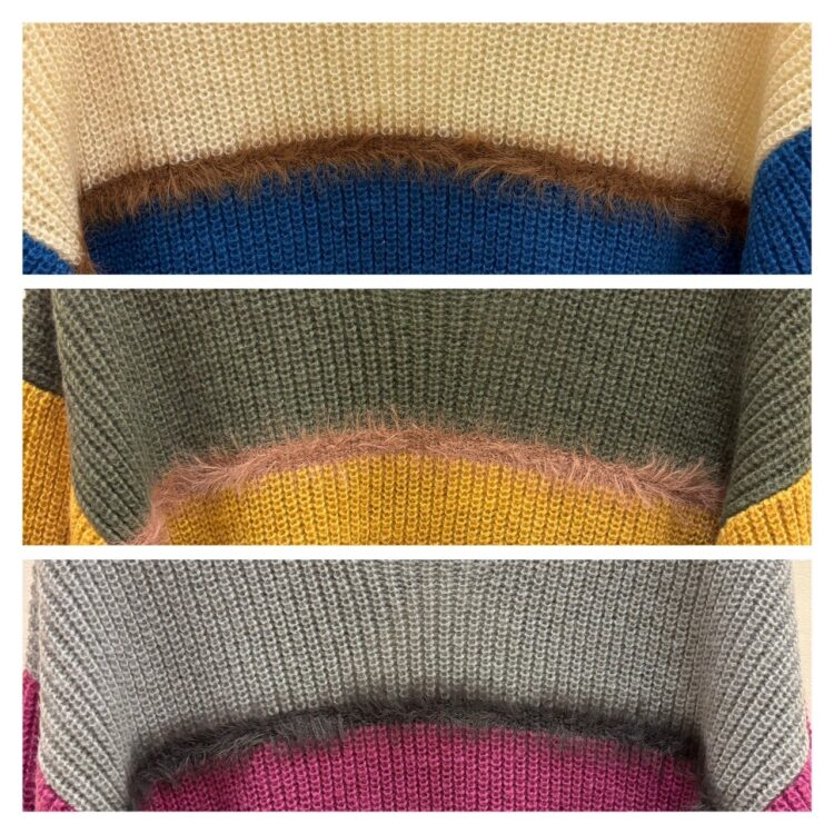 カラーが途中でブロッキングされているのですが、よーく見ると切り替え部分の毛糸が毛足が長い毛糸に切り替わっておりモヘモヘふわふわしてます!可愛い!!♡