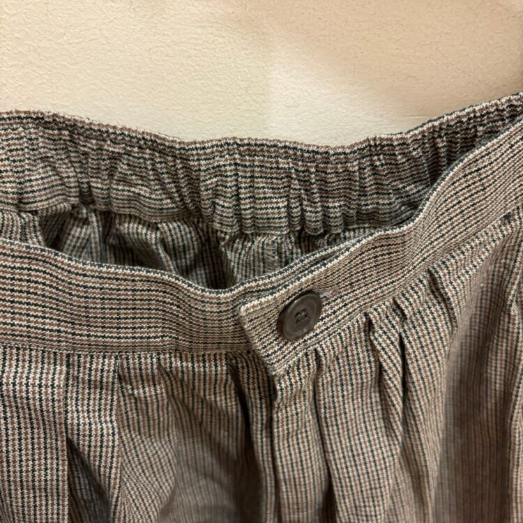 ウエストはフロントスッキリ、後ろがゴムになっていて楽です♪タックがふんだんに入っていて、着心地はふんわりなのですが、見た目はタックのおかげで縦見えするシルエットになっています◎