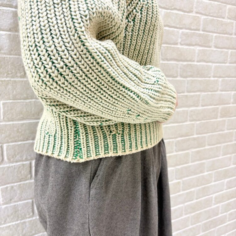 白と緑を使用した毛糸で編まれているニットですので、畦編みの模様が立体的に見えますし目立つので、シンプルになりすぎなくて可愛いです♡