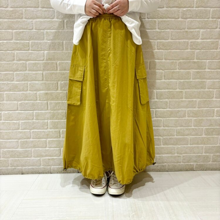 こちらのスカートは裾がドロスト仕様になっており、シルエットに変化が付けれる為着こなしの幅が広がります。