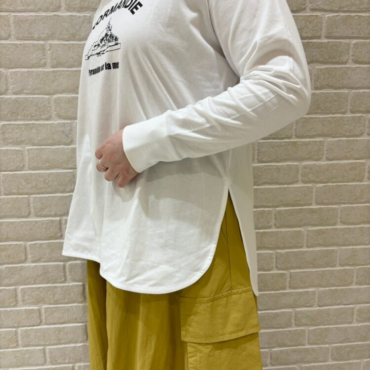 袖はスッキリしたシルエットなのでインナーとして活躍!深めに入ったサイドスリットでスカートのシルエットを崩さず、でも隠したいところはしっかりカバーできます◎
