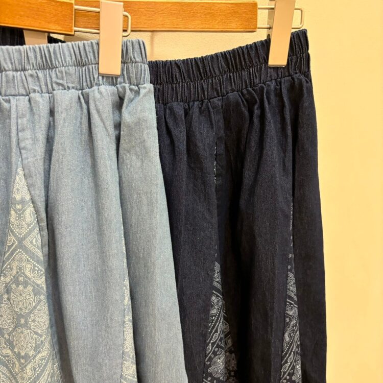 デニムとペイズリー柄の切り替えが縦に入っており、ドレープ感も相まって動きのあるデザインとなっています♪