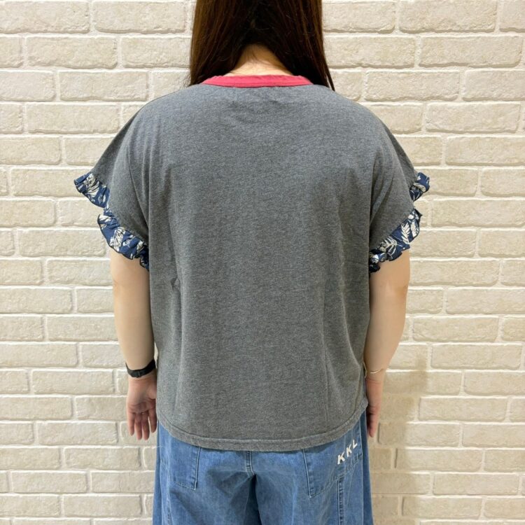 26/-天竺パウダー加工リメイク風袖口フリルプルオーバー