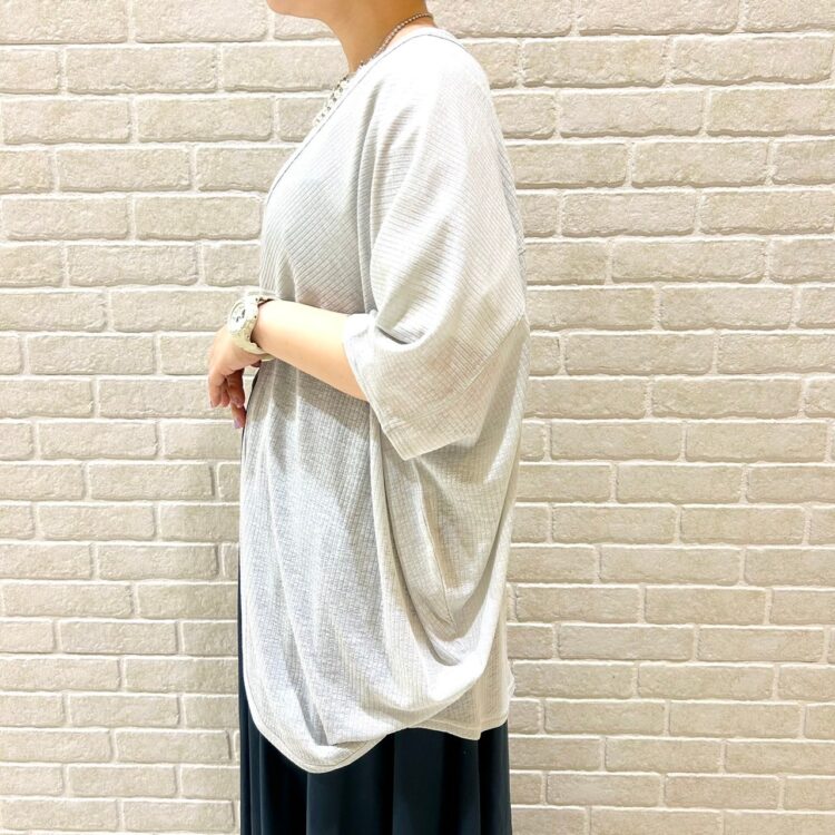 ドルマンスリーブのため、中がどんなトップスでも着やすいです!袖丈は6分程✨️
