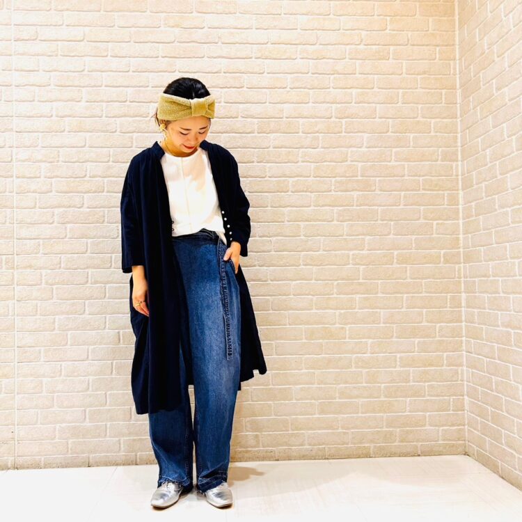 膝丈くらいなので、細身のボトムスも、ワイドパンツでも合わせやすいです。