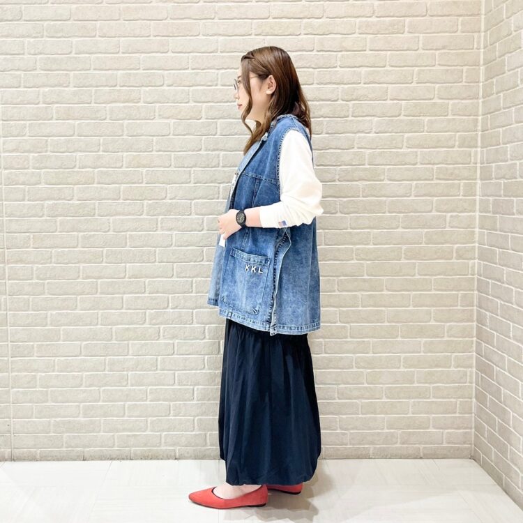 カジュアルなデニムベストにシックな黒スカートを合わせました!!