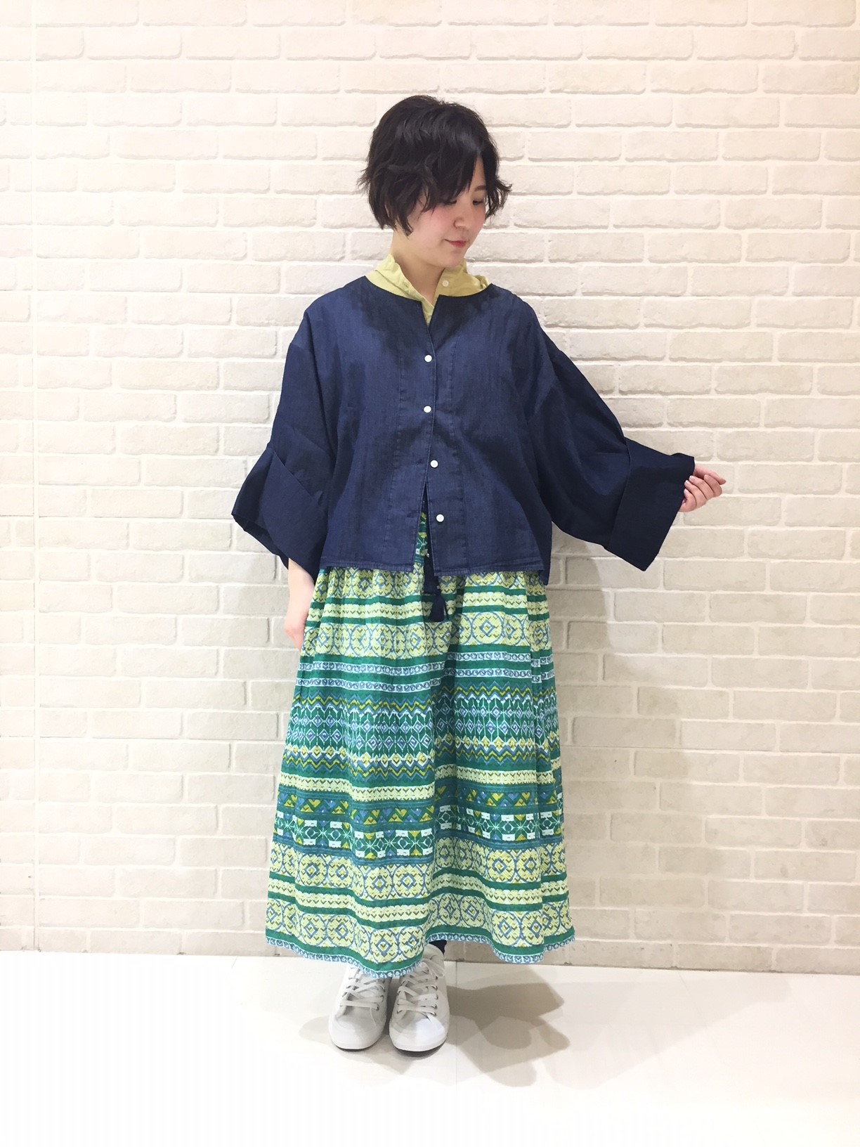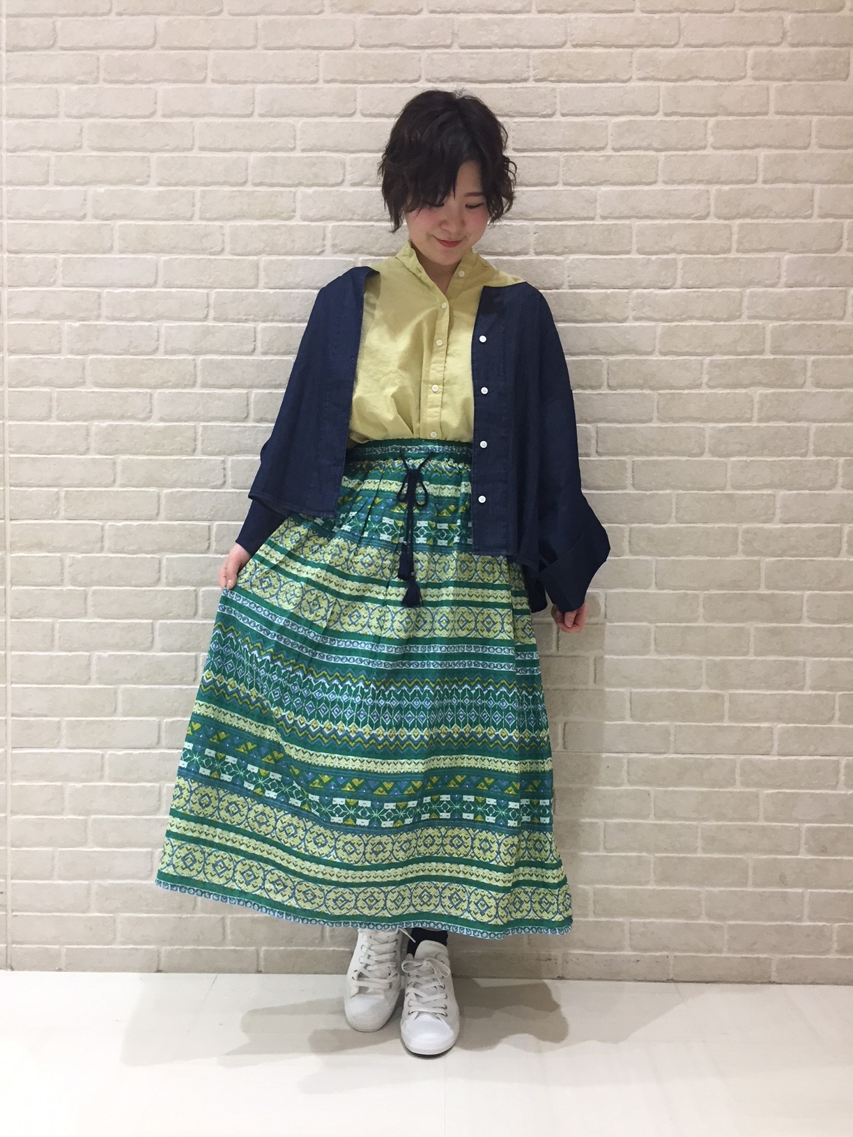カラフルな柄スカートは、コーデにメリハリを持たせられるアイテム。