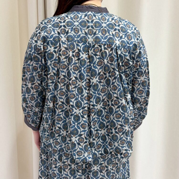シルクタッチボイルタイルプリント裾ドロストバンドカラーシャツ
