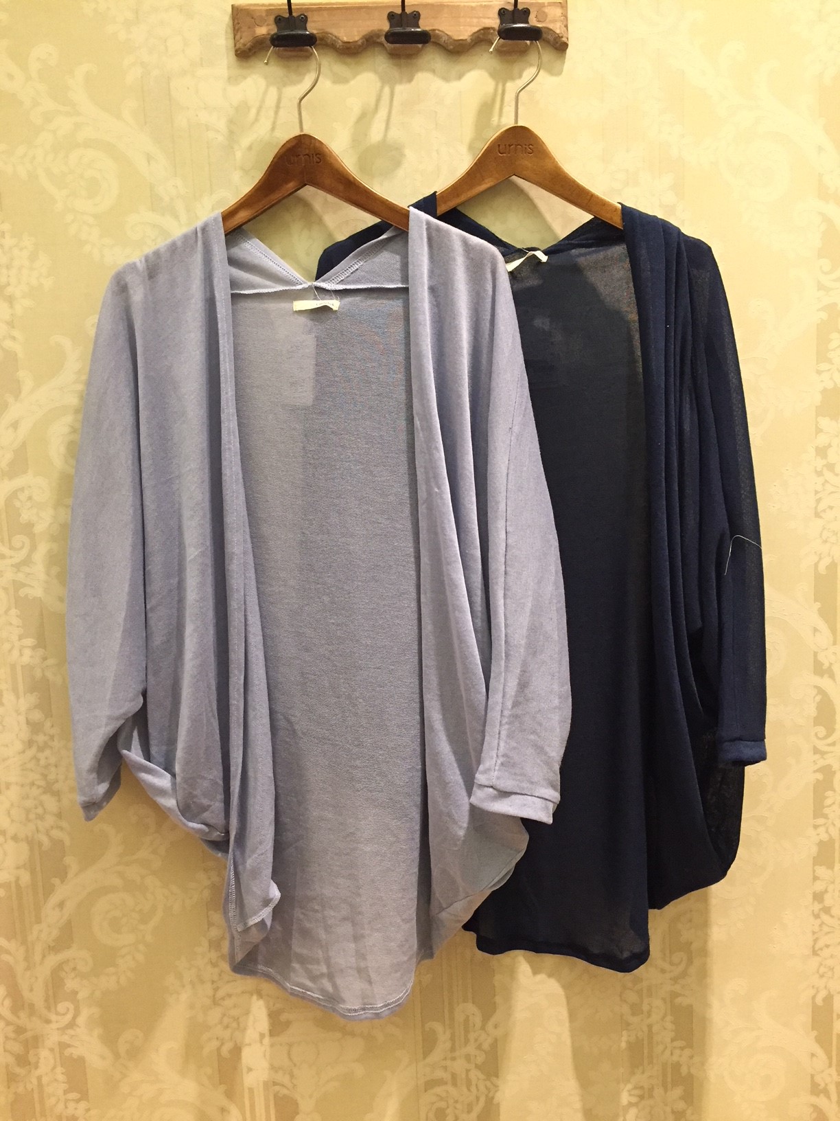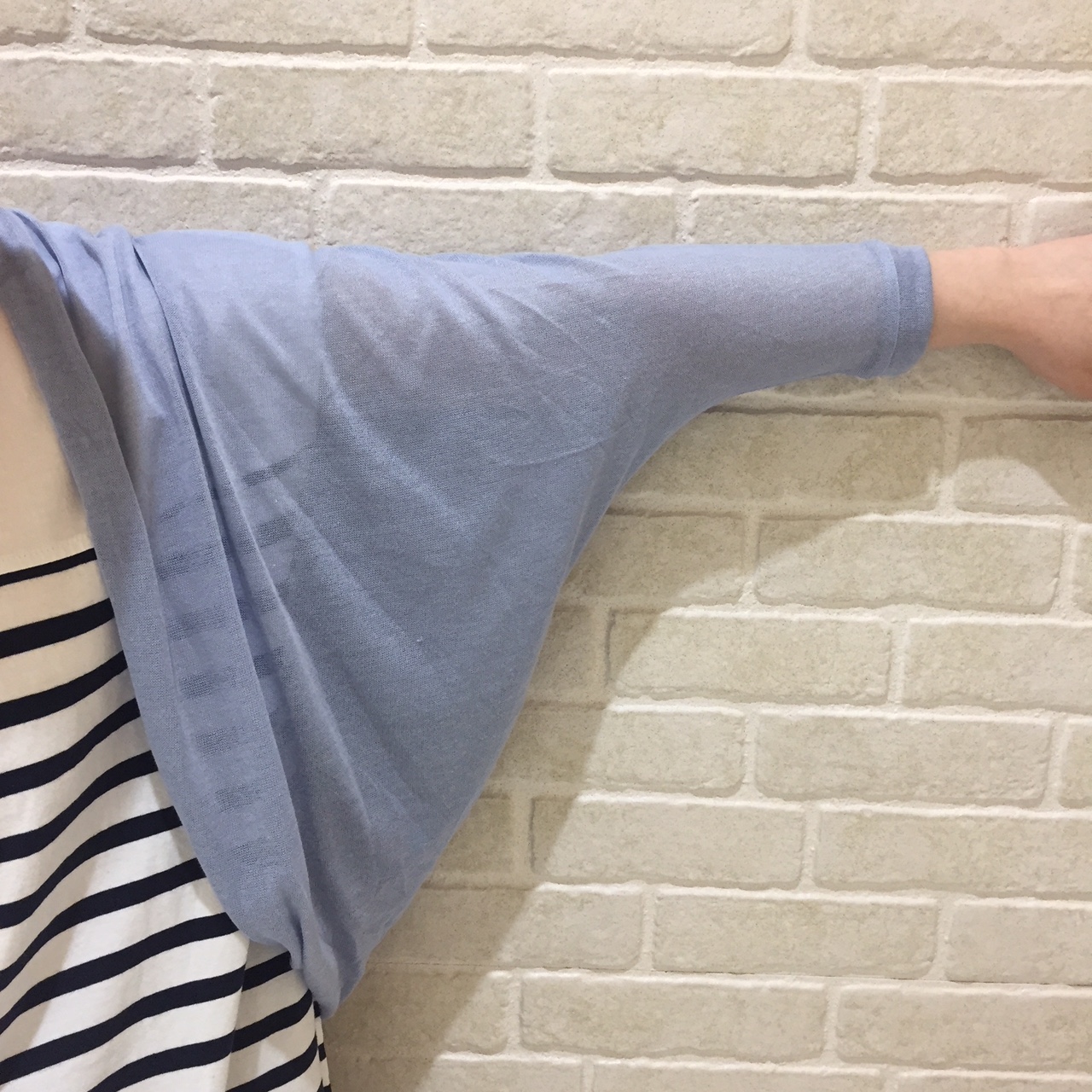 肩がけしたカーディガンは軽い素材で涼しく、さらりとした着心地!