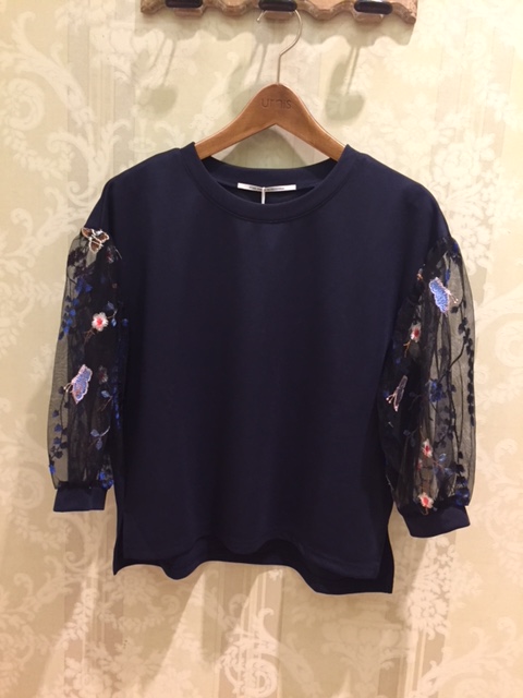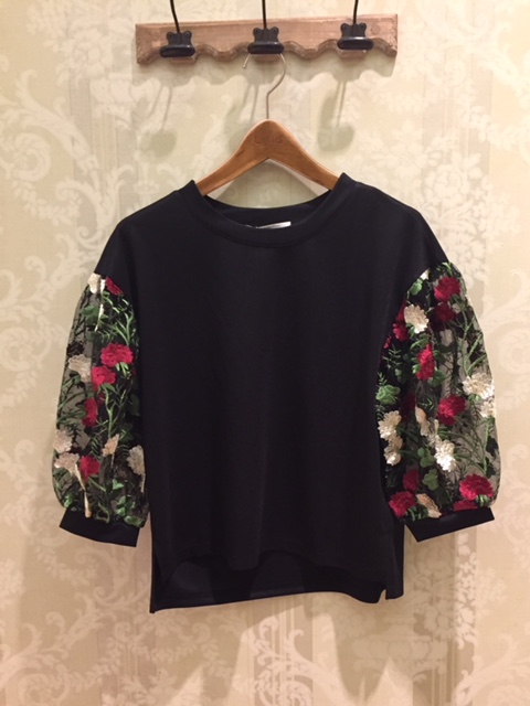 お花チュールレースのボリューム袖。身頃は伸縮性のあるジャージー素材で動きやすいです。
