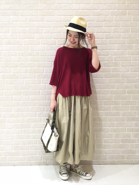 こちらは”赤”をメインカラーに、ベージュ×カモフラ小物でまとめた大人ナチュラルスタイル。