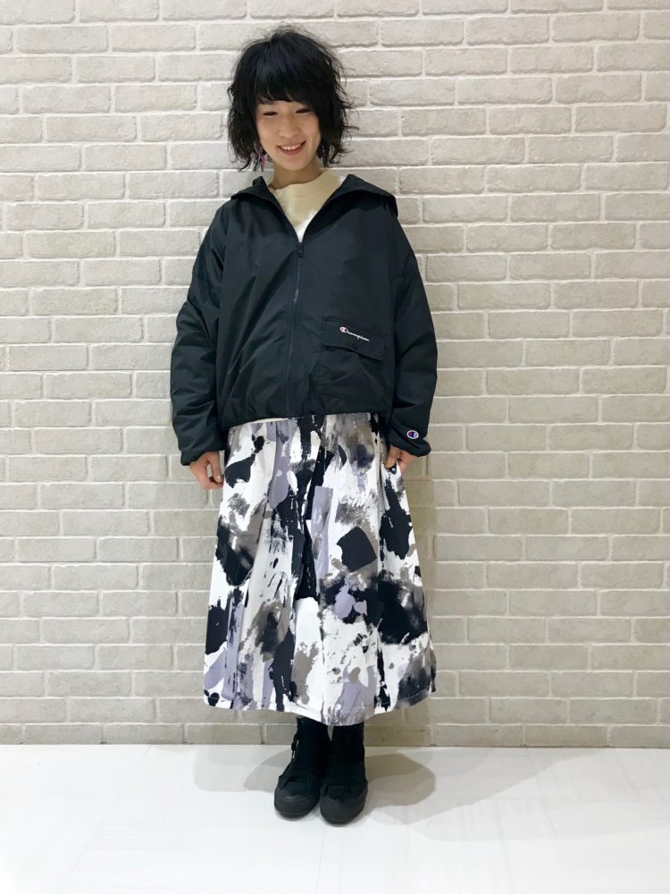 championジャケット(スポーティ)に、ペイント風の柄スカート(きれいめ)を合わせたMIXコーデに。