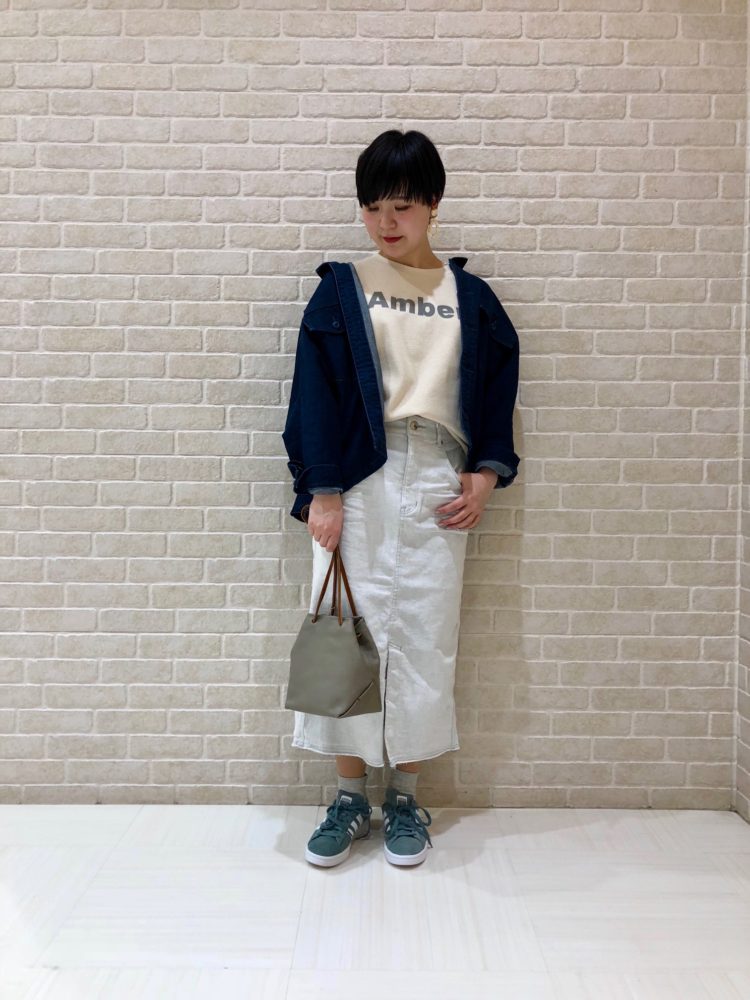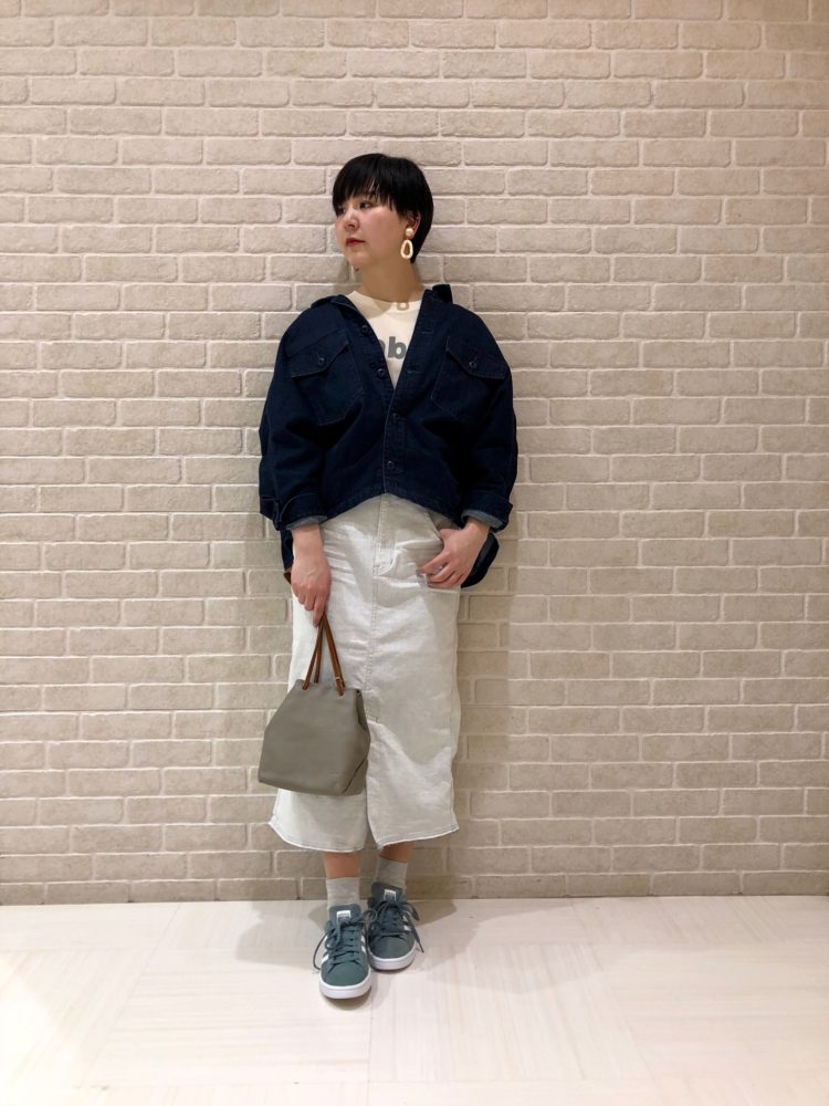 インディゴとホワイトの組み合わせに、足元のスニーカーで柔らかい差し色をオン。